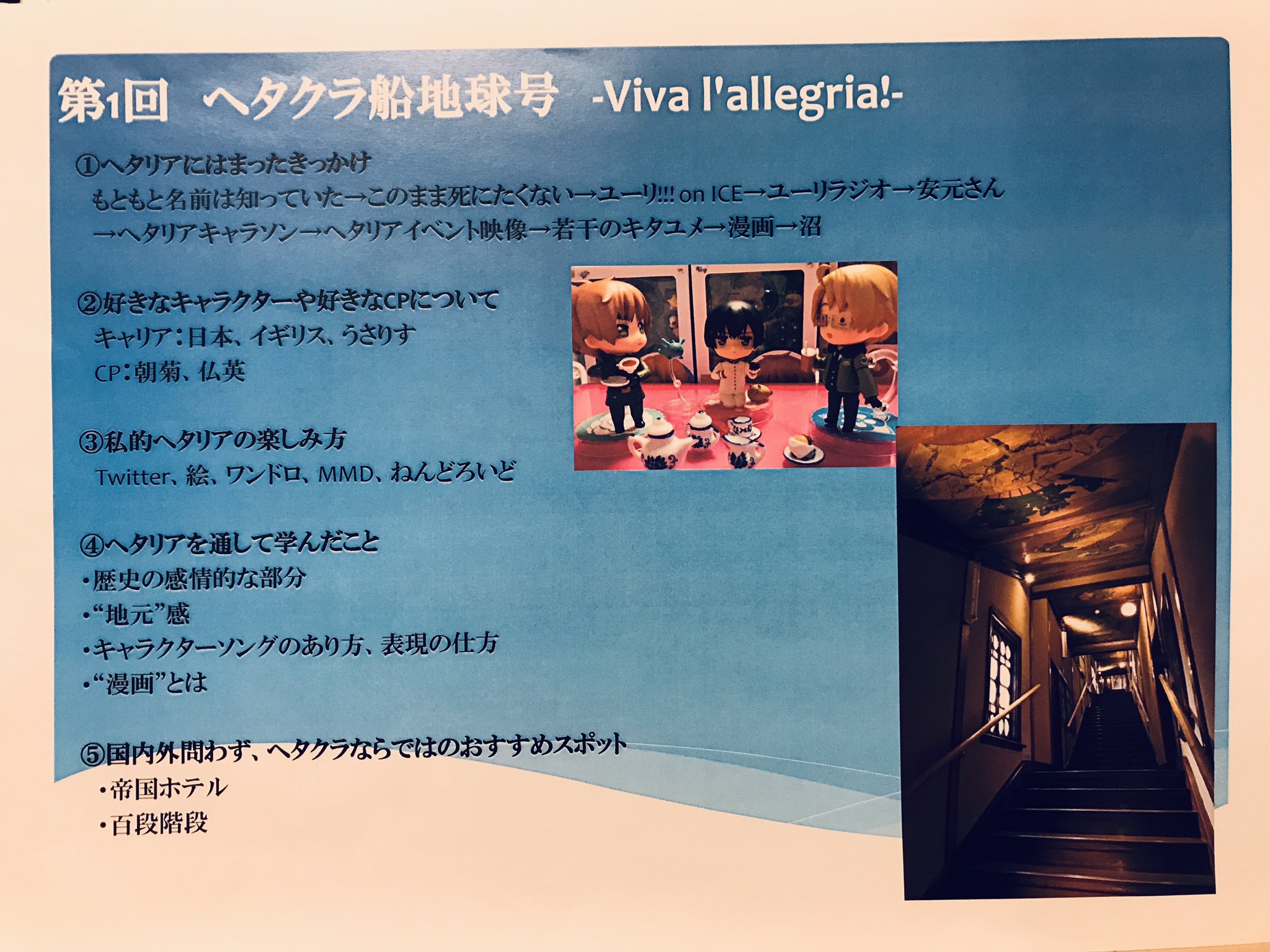 海外留学していた方や海外在住の方がいたため、 みなさんの ”肌で感じた世界” を聞くことができました! まずはAさん! デンマークやドイツへの留学経験がある乗組員です。 小学生のときに歴史に興味を持ち、お友達からヘタリアをすすめられ、 順調にヘタクラの道を歩んできたAさん。 イギリスのサマースクールに行ったときは、 「ご飯はまずいし、フィッシュ&チップスも固い」という イギリスのメシマズ砲撃に合ったそうです。 一番おいしかったのはケンタッキーだったそうで(笑) ハンブルクで買ったドイツ語版ヘタリアもお持ちで、 語学堪能ゆえに歴史・言語・国民性などいろいろ比較して楽しむことができるそうです。 知識が増えれば増えるほど、ヘタリアでいろんな角度から遊べますね! |